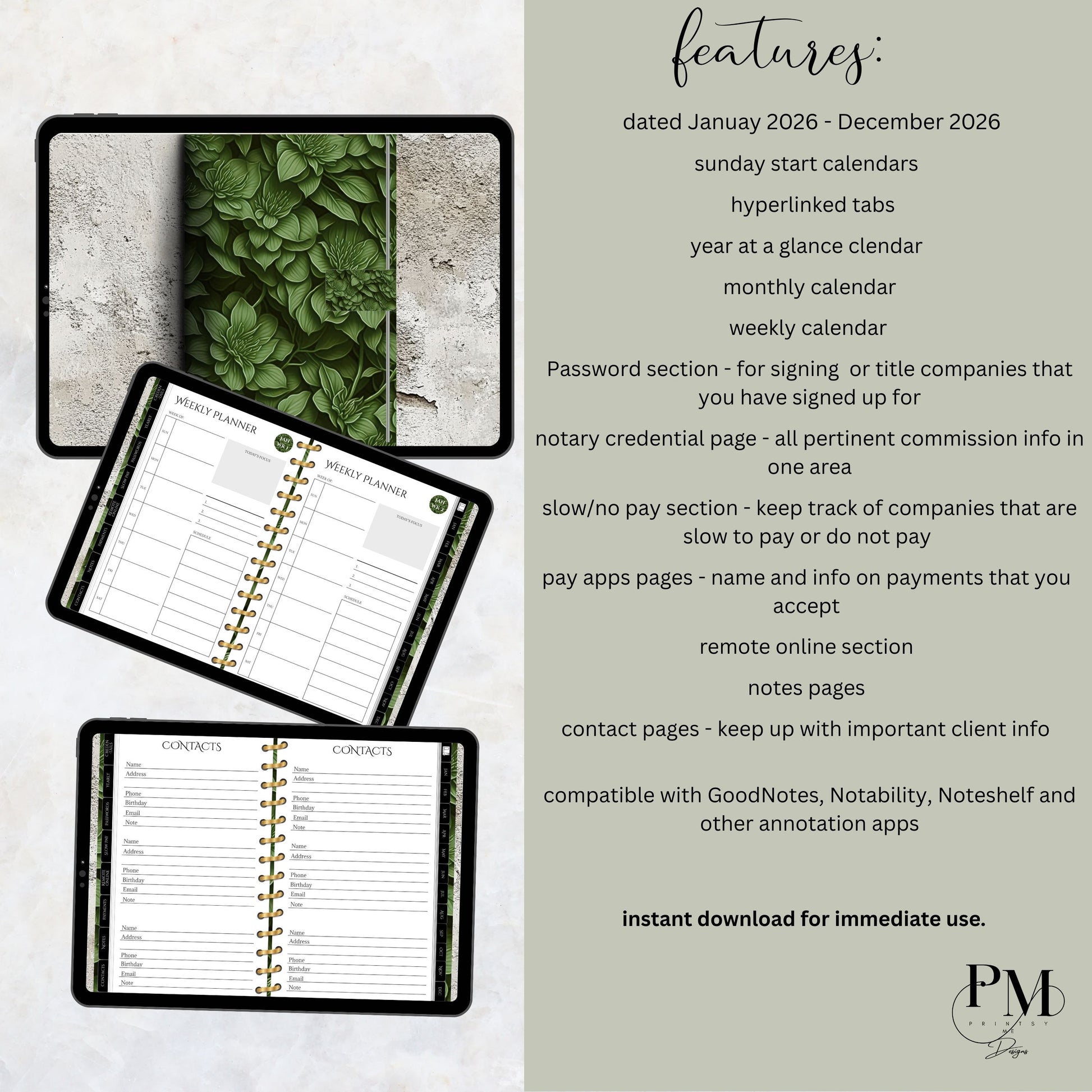 Designed with the busy Notary/Signing Agent in mind, these beautifully crafted digital planner helps you stay organized and efficient throughout your year.  Whether you’re managing credentials, tracking payments, or keeping up with deadlines, this planner is your all-in-one solution.